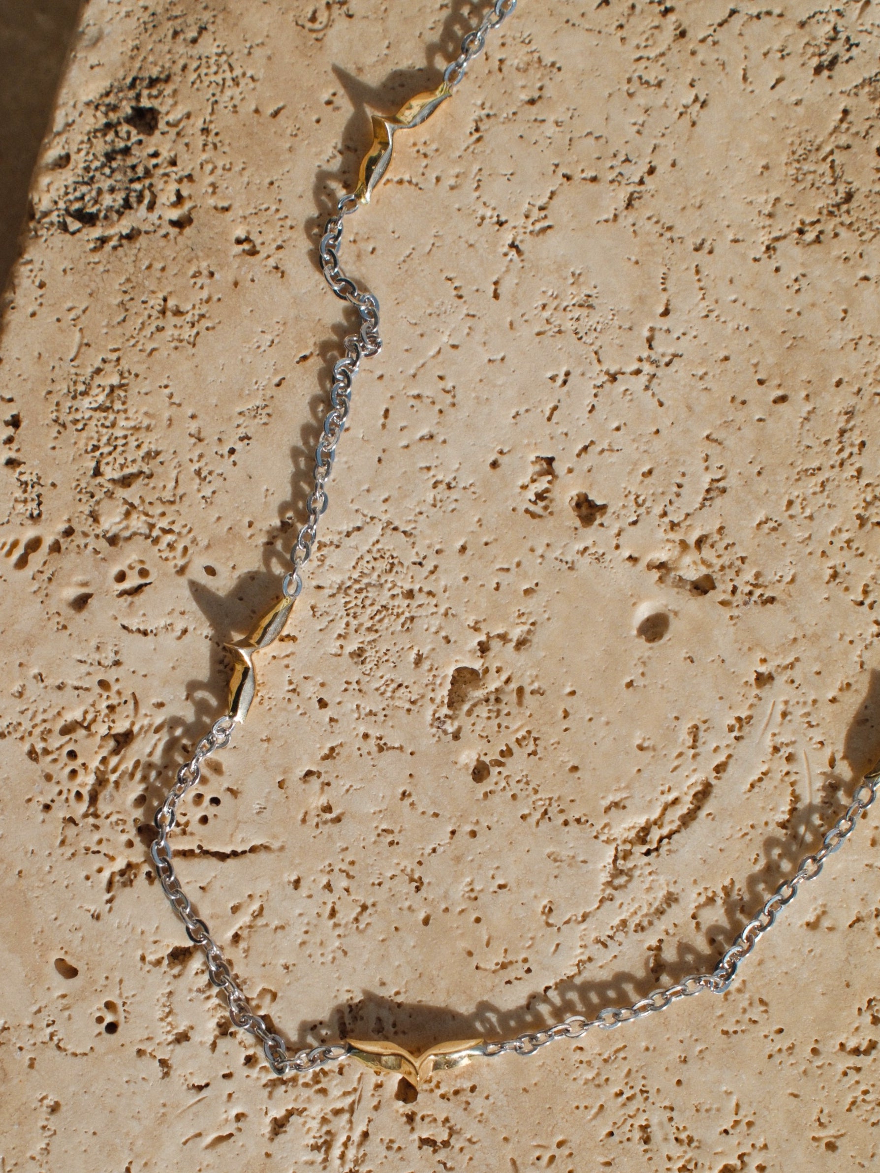 The Suhair Necklace embodies balance and continuity, a circle of keffiyeh-inspired olive leaves cast in yellow gold, set against a fine white gold chain. Its 360 design honors the unbroken thread of heritage, strength, and grace that endures through time.
